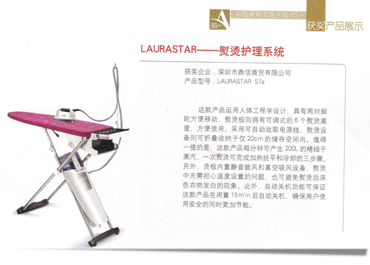 今天小编收到《2014中国家电艾普兰奖》产品展示资料,其中LAURASTAR S7a被授予为数不多的“科技创新奖”。