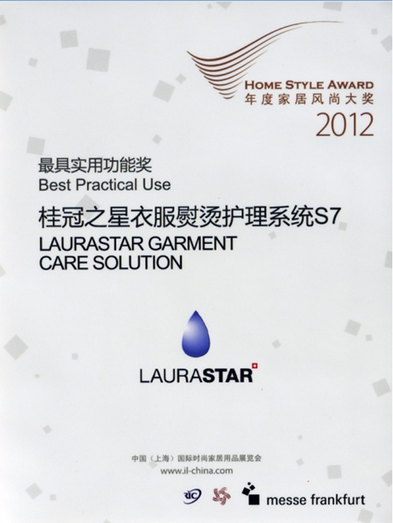 10月10日—13日,LAURASTAR携四款代表产品惊艳亮相2012上海时尚家居展。通过专业的产品演示,及至臻奢华的品牌形象,展位吸引了众多专业观众及客户的关注与咨询,甚至在产品正式销售前期,获得不少客户的产品预订单。另外,LAURASTAR-S7型号产品从248家15个国际及地区的展商品牌产品中脱颖而出,荣获“2012年度风尚大奖 最具实用功能奖”!